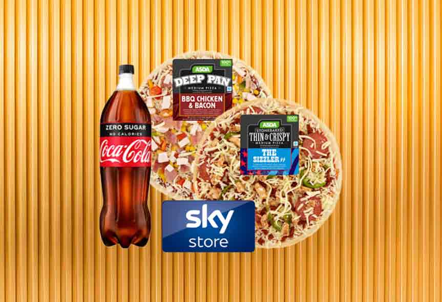 The deal is for two medium-sized pizzas a share size bottle of Coke or Fanta and a Sky Store movie. Opens a new window. Getty 10000 Hours. Back by popular demand Asda has relaunched its great value Pizza Meal.